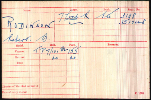 Robert Beeley ROBINSON was born in Horncastle, Lincolnshire (Horncastle Q3-1896 7A:541), son of Frederick and Annie Maria M ROBINSON (née PERKINS). His photograph here when he was about 9 -10 years old. 1901 census...Aged 5, he was with his mother Annie ROBINSON [32] born Deeping St Nicholas, sister Florence [3] and brother Cyril P [5] months], visiting his grandparents, Robert and Ann PERKINS and his aunts Susannah and Tya, at the Racecourse Ground, Spalding. All three Robinson children were born in Horncastle. His father, Frederick ROBINSON [39] a draper/grocer born Burgh, Lincolnshire, was at home, at High Street, Alford, Lincs. 1911 census...Aged 14, he a pupil was at the East Anglian School, Bury St.Edmunds. His parents and brother Cyril Perkins ROBINSON were at 21 Queen Street, Horncastle. |