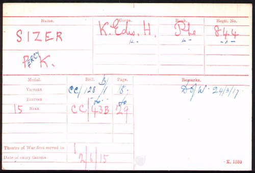 He enlisted in London when resident in Colchester. The website http://kingedwardshorse.net/history.html has the war diary entry:- St Quentin 23 to 24 March 1917 - "C" Squadron holding defence posts lost a patrol on 1 NCO and 3 men reconnoitring towards BOIS de HOLNON, wounded and missing. Desultory shelling of ETREILLERS. IV Corps C.M.T. in touch 9th Hussars and 28th French Division on right and Indian Mounted Troops 3rd Corps at CAULAINCOURT on the left. French infantry take ROUPY after slight resistance. AMBAL Cavalry Brigade arrives at ESTREE-en CHAUSEE. "A" Squadron patrol under 2nd Lieutenant LINTON reconnaissance to VILLEVEQUE and have one man killed (844 Private Percy Kenneth Sizer KEH (Japan). BGGS and CRA IV Corps visit posts. Messages from Corps Commander congratulating KEH and IV Corps Cyclists on their work.