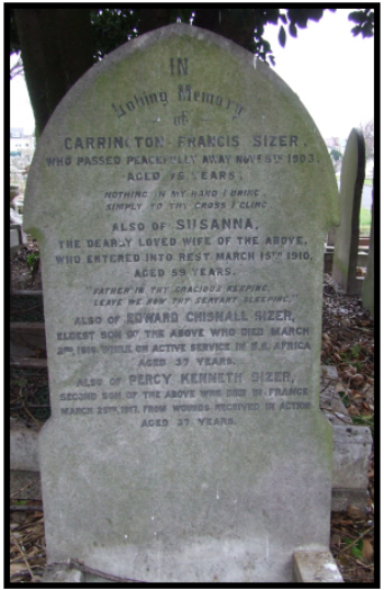 Sizer monument at Queen's Road Cemetery, Walthamstow. photo: Commonwealth War Graves Commission also commemorated on the Great Bentley war memorial . |
