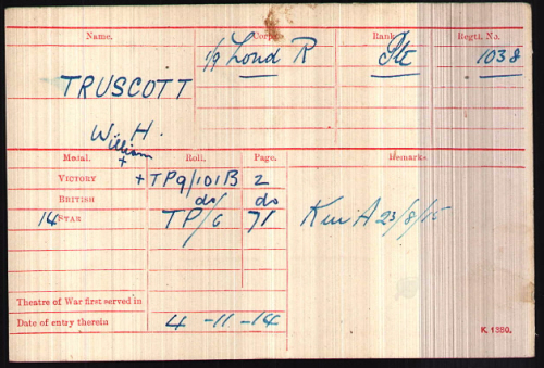 William Henry TRUSCOTT was born on 1884 in Maidenhead (Cookham Q3-1884 2C:413), son of John and Sarah Jane TRUSCOTT (née MOORCOCK).