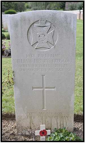 1891 census...Aged 6, he was at York Lodge, York Road, Bray, Cookham, Berks with his father John TRUSCOTT [44] coal and corn merchant born Oxford; his mother Sarah J [39] born Wokingham; brothers John A [12] and George A [2 months]; sister Florence M[3]. All the children were born in Maidenhead. 1901 census...Aged 16, a commercial clerk, he was still at York Road with his parents; brothers John (corn merchant's manager) and George and sister Florence. 1911 census...Aged 26, a salesman of furnishing fabrics, he was at 2 York Road, with his parents; brother George Abercrombie (clerk for furniture removal) and sister Florence Mary. Brother John had died in 1910 in Maidenhead. His father was now an Alderman in Maidenhead. Confirmation of his identity and school connection comes from the school roll of honour which includes the regiments |