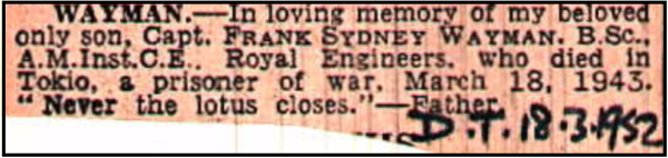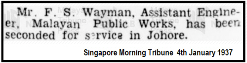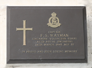1911 census... Aged 5, he was at 59 Elmer Road, Catford, with his father Frank WAYMAN[32] surveyor's assistant born Westminster and his mother Sarah Ann [32], born Greenwich. Frank is commemorated on the memorial plaque of King Edward VI Grammar School in the Cathedral, but WAYMAN, Captain Frank Sidney, BSc, AMILCE, R.E. was at the East Anglian School spring 1916 – 1917). In 1928 he was at 25 Northcott Avenue. Wood Green N22. In the 1939 register at 1 Westgate Street, Bury St.Edmunds were his father Frank [29-7-1878] a surveyor/valuer; his mother Sarah A [29-1-1879] and sister Margaret E [15-6-1916]. Possibly he was the F.S.Wayman who sailed from London on the "Morea" on 10th August 1928, bound for Singapore. Records show a Frank S WAYMAN marrying Violet G DIX in 1933 in Edmonton. He was accompanied by his wife (not named) when he sailed from London to Singapore on 17th March 1933 on the "Carthage". It appears that on his return to UK in 1937 his wife was recorded as Violet, they were with their daughter 3 yrs old Margaret( they were visiting his parents). He was accompanied by his wife (Violet Gladys DIX) and 3.5 years old child when leaving London on 24th February 1938 for Singapore on the "Rawalpindi". An Ancestry record gives Violet as dying in Singapore in 1939, but no source given. He married Kathleen Miriam (?). of 19 St. Andrews Road, Caversham, Reading, Berkshire. His marriage details have not been found, possibly he married in Singapore. This will require a copy of the certificate if possible. His will gives his widow as Kathleen Miriam WAYMAN