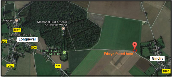 The 24th Battalion, Royal Fusiliers was also known as the 2nd Sportsmans battalion. The war dairy has 30-7-16..trenches..At 4:52 am C Coy attacked the German trench 600 yards E of WATERLOT FARM. The attack was unsuccessful owing to the wire not being cut and the difficulty of maintaining direction owing to thick mist. Of the 3 officers and 114 other ranks who made the attack, 1 officer (wounded0 and 11 other ranks got back. Capt MEARES was killed on the German wire leading his men. There were several other casualties from very heavy shell fire. A very hot day. 31-7-16...Battn was relieved at 3:15 am by 2nd H.L.I. and moved back to reserve trenches SW of MONTAUBAN. Several killed during relief. Waterlot Farm was not a farm but a sugar factory. CWGC have 62 of the battalion as killed on 31st, only twenty have known graves, the rest are named on the Thiepval memorial. Edwyn was posted missing on 31st July 1916, initially found and recorded as 3171, 21st Battalion, the registration card was amended when he was moved to Delville Wood Extension Cemetery in 1921