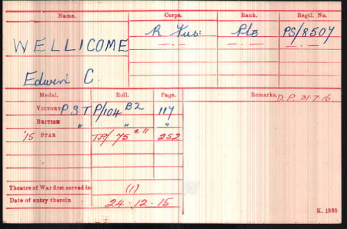 Edwyn Cyril WELLICOME was born 1889 in Marlow (Wycombe Q3-1889 3A:667), 4th of 5 sons of Richard and Emily WELLICOME (née COSTER). 1901 census...Aged 4, he was at 5 High Street, Marlow with his parents; sisters Alice, Ellen and Mabel C[7]; brothers William [11], Charles D, Arthur R [9], and Edward P [2]. The new siblings were all born in Marlow. 1911 census...Aged 14 he was still at 5 High Street, with his mother, a milliner, with his sisters Florence (Ellen) and Mabel and brother Cyril (Edwyn) [14] born Marlow, an outfitter's apprentice. 3 of Edith's 11 children had died (Gladys Amy 1882-1884), Emily May (1881-1890) and Edward Percy (1899-1902). His father has not been identified in this census. His mother's address given by CWGC was 10 Glade Road, Marlow, Bucks. His brother William was killed serving in France in the Seaforth Highlanders in November that year. Brother Willie is named on the East Anglian School roll of honour, but not Edwin. see here |