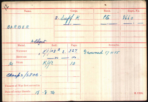 Albert Barber was born in Rede (4th qtr 1894 Thingoe 4a:767), son of Robert and Keziah Sarah BARBER(née CHALLIS)