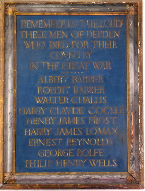 Inside the church of St.Mary's Depden on the wall is a wooden board, 71cm high, 53cm wide, with gold lettering on a blue ground.