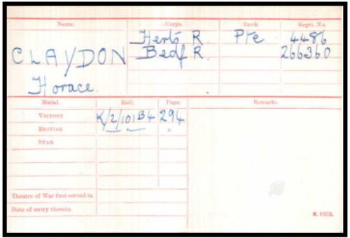 Horace Claydon was born in Dullingham on 19th May 1891, (Newmarket Q3-1891 3B:497), baptised in Dullingham on 4th October 1891, son of