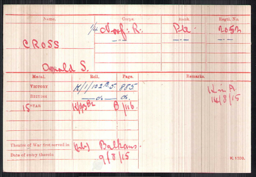 Donald Stewart Cross was born on 4th May 1896 in Elveden (Mildenhall Q2-1896 4A:816) son of James Willie and Edith Maria CROSS (née FITT ).