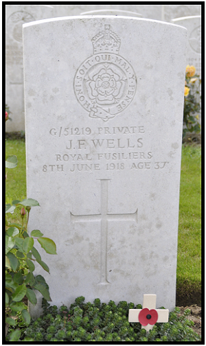 1891 census...Aged 10, he was at 12 Ford Street, Hunslet, Leeds with his father James WELLS [47] labourer, born Whepstead; his mother Alice [51] born Bury St Edmunds; brother John [14] (ropemaker) born Whepstead. He was admitted to Elveden Voluntary Aided Primary School on 7th September 1891.( from Leeds Board School) 1901 census...Aged 19, a garden labourer, he was at Barnham Road, Elveden with his parents (mother now recorded as born Ixworth). 1911 census...Aged 29, single, gardener's labourer, he was at Barnham Lodge, Elveden with his parents and a cousin Mabel Alice CAWLEY [5], born Castleacre, Norfolk. Mabel was later adopted by his sister in law, brother John's widow. His elder brother John James Francis Wells died in France in November 1918 17 days after the Armistice. see here |
