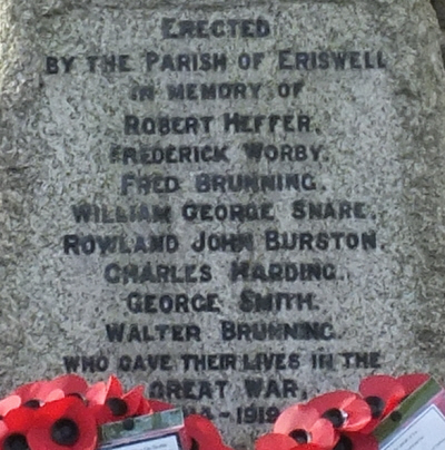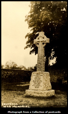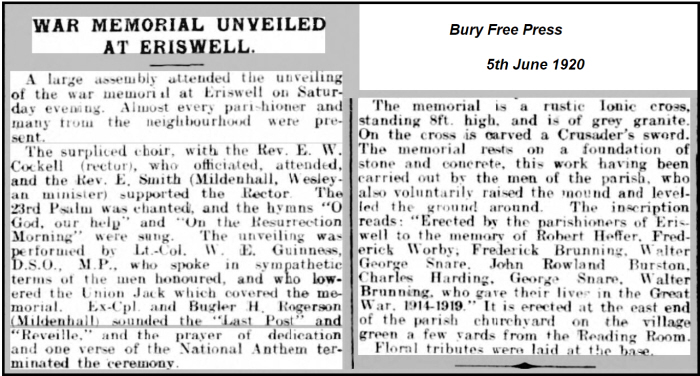 Sited at St Laurence's Church, Eriswell, between the churchyard wall and the road Ordnance Survey Map Ref:TL 724 780 It is a simple 8 feet high Celtic cross of granite on which is carved, in relief, a sword, point down. All on granite chippings within a stone kerbed, low stone post and chain surround. Unveiled on 29th May 1920 by Lt.Col W.E.Guinness DSO MP and reported in the Bury and Norwich Post on 5th June 1920. © IWM (WMR-4539)