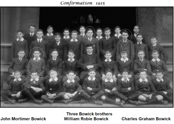 1901 census...Aged 2, he was at 27 Canfield Gardens, Hempstead, with his grandfather Thomas BOWICK [68] journalist and author, born Scotland; his grandmother Elizabeth S [62], born Kenilworth; Aunts Skye [31] professional singer and Ellen [26] reciter, both born in Bedford. His parents were at 71 Pelham Road, Wimbledon, father John Robie BOWICK [40] grain merchant born Warwickshire; mother Isabel M [35] born Guernsey; brothers, Charles [1] born Southall and Jack (8 days), born Wimbledon. 1911 census...Apparently the student William J.R. BOWICK at St. Saviours College, Ardingley, Haywards Heath. His mother was at 27 Welldon Crescent, Harrow On The Hill, Harrow with his brothers Charles Graham [11] born Southall and John Mortimer [10] born Wimbledon; sisters Winifred Maud [8] and Helen Marjorie [6] both born Wimbledon. He was a student at Bedford Grammar School until 28th March 1916. His brother Charles Graham BOWICK, born 10th July 1899 in Uxbridge was with the Y.M.C.A. in France and died there on 3rd May 1918. He was killed by a shell and is buried in Lapugnoy Military Cemetery, grave 6:F:1