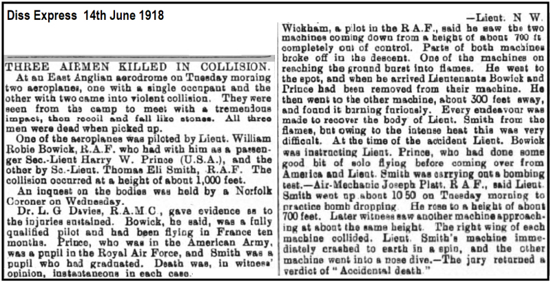 photo courtesy his great nephew, Jim Hague He was resident with his father at 178 Foster Hill Road, Bedford on enlistment. Commission gazetted LG 16 June 1916, from 2nd Lt to Lieut on 3 August 1917. He had served at the School of Special Flying, Gosport and had flown Caudron AAF(SH and LH); BE8A; BE22 C and E; BE12; RE8; Avro AW (90 and 160 hp) ; DH6 and DH4. The "Avro AW (90 and 160 hp are most likely to be the Armstrong Whitworth FK3 and FK8, and the Avro referring to the Avro 504). Again I do not have the original to hand to check the transcription) My thanks to his great nephew, Jim Hague, for corrections to the list of aircraft. A second look at his records on the next visit to Kew is called for. Seemingly then a skilled airman, who had served with Nos 7; 48 and 38 Squadrons RFC, becoming an instructor on 29 August 1917 at No 12 Training Squadron, based at Thetford (Snarehill), about 1 mile north of Euston Hall He was flying in RE8 ser no 787 from nearby Thetford (Snarehill) airfield. William, with an American in the Royal Flying Corps, 2nd Lt. Harry Walter PRINCE as passenger, was in collision with an aircraft piloted by Lt.Thomas Eli SMITH, R.A.F. All three died. Lt Smith was taken home to Walsgrave for burial and 2nd Lt. Harry Prince rests at the American Cemetery, Brookwood, Woking. The accident seems to have been reported in newspapers from Devon to Northumbria, but the most comprehensive were the reports published in THE NORFOLK CHRONICLE 14 June 1918: AIRMEN KILLED IN NORFOLK:- An accident involving the lives of three airmen occurred in Norfolk on Tuesday through two machines colliding. One of the aeroplanes was piloted by Lieut William Robie Bowick RAF who has as a passenger Sec-Lieut Harry W Prince (USA) and the other by Sec-Lieut Thomas Eli Smith RAF. The collision occurred at a height of about 1000 feet and the three occupants of the machines were dead when removed from the wreckage. and following from the Diss Express