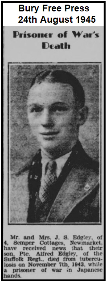 Born in Q3-1920 [Newmarket 3b:918],(22nd July 1919 according to his Japanese PoW card) to Samuel William and Jessie Susannah EDGLEY (née SNOWDEN) of 4 Semper Cottages, Newmarket.
