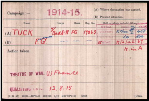 1891 census...Aged 9, he was at Reed Pond Cottages, Hengrave with his father Jessie TUCK [48] Gardener born Stowlangtoft; his mother Rebecca [49] born Bardfield, Essex; brother John [15], a gardener; sisters Lizzie [13] and Lillie [11]. The children were all born in Hengrave. There were three elder sisters, not here for the census, Mary Ann [11] born Stowlangtoft, Caroline [10] and Ellen [8] both born in Hengrave. 1901 census...Aged 19, a domestic gardener, he was boarding with the COBBETT family at Halfway Cottages, Westerfield, Ipswich. His parents were still at The Street, Hengrave with his 5 years old nephew, Bertie. 1911 census...Aged 29, fireman/gardener, he was at Grims Dyke Gardens, Harrow Weald, Middlesex, head of house, with boarder Oliver COOPER [21]from Dorset, another gardener. This was the home of Sir William Gilbert (of Gilbert and Sullivan), the gardens being designed by Lady Gilbert..His parents were still in Hengrave looking after his nephew Bertie. Frederick's Register of Soldiers Effects entry has as a sole legatee a Miss Ellen CARRINGTON. His nephew Bertie Tuck died in France 3 months later. see here |
