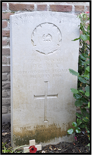 Mr, Tuck, late gardener of Hengrave Hall, has just received the sad news of the death of his youngest son, Frederick George, who was killed in action on July 1st by a bullet in his chest. Until he joined the Army, in September 1914, the deceased was employed as a gardener to Lady Gibbert, of Grims Dykes, Harrow Weald. He was in the Bedfordshire Regiment, and had been in France since August 1915. He was 35 years of age. Deep sympathy is felt for is parents, five sisters, and only brother, who is on active service in Salonica. Deceased was engaged to Miss Carrington of Wickham Bishops, who has the sympathy of a wide circle of friends...