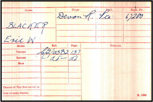 1901 census...Aged 2, he was at Park House, Euston with his father Edward W. BLACKER [32] gamekeeper born Euston; his mother Mary A [40] born Caldecote, Rutland; sisters Winifred M [9], Florence A [7] and Eleanor A [4]; brothers Charles E [6] and Herbert A [1]. All the children were born at Euston Park. 1911 census...Aged 12, he was at Park House, Euston with his parents; sisters Winifred Mary, Florence Ann, Eleanor Alice and Marjorie [7] born Euston; brothers Charles Edward and Herbert Alan CWGC have his mother at Barnham, Norfolk, as does the pension card. No documentation has been found linking Eric with Fakenham Magna, but he is the most likely man here. |