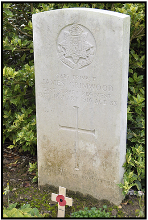 James Grimwood was born in Bury St Edmunds on 4th March 1885 (Bury St.Edmunds Q1-1885 4A:725), private baptism at Thingoe House, 26th March 1885, son of