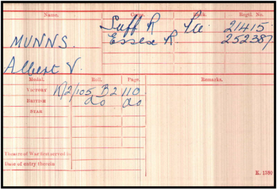 Albert Victor Munns was born in Fordham 21st September 1899 (registered as Victor (3rd qtr 1899, Newmarket 3b:521), baptised in Fordham on 29th October 1899, the son of Charles and Jemima MUNNS (née BULLEN). His father was first married to Mary Louisa BUTTRESS (Newmarket Q4-1888) by whom he had a son Arthur, born and died Q4-1889, and then another Arthur born Q1-1891. Mary Louisa died in 1893. Arthur was with his parents in Chippenham Road, Fordham for the 1891 census, and in 1901 was next door to his father, with aunt Eliza BUTTRESS His father married Jemima BULLEN, Q1-1894. 1901 census...Aged 1 (entered as MUNSES) he was at Church Street with his father Charles MUNNS [35] chimney sweep; his mother Jemima [27] born Kingston, Cambs; sisters Dorothy Ellen [6], Harriet Emma [4], Edith Mabel [3] and Frances Victoria [1]. 1911 census...Aged 11, he was at Church Street, Fordham with his parents, brother Arthur (grocer's assistant); sisters Edith Mabel and Victoria and new siblings, brothers George Edward [9] Wilfrid Curl [6], Sidney Alfred [6] and Frederick Charles [1], and sisters Margaret Gertrude [4] and Lilian Jessie (under 1 month]. All the new children were born in Fordham. Apparently there were two sets of twins, Albert Victor and Frances Victoria born in 1899, and Wilfrid and Sidney born in 1905. His family were later at Summerfield, Fordham. The penson card has them i market Street, Fordham. Brother, Arthur, (born 1891) who served as a driver from 1915 to 1920 in the Army Service Corps. Three cousins, the Munns brothers also died as a result of the Great War. Edward Charles Munns who was actually TURNER see here and Samuel Munns died of illness in UK in 1919. see here and William John Munns killed in action in France in 1915 see here |