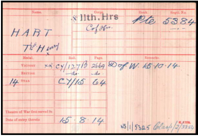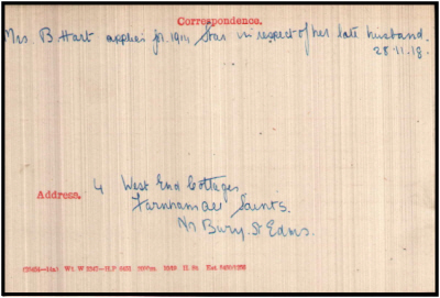 1891 census...Aged 3, he was at Frost's Court, Fornham All Saints with his mother Elizabeth HART [27] born Bury St Edmunds. His father, previously a wheelwright, was now a Sapper in the Royal Engineers in Aldershot. His brother William Elijah HART was with his grandparents William and Alice GOOCH at Batchelors Hall, Fordham All Saints. 1901 census...Aged 13, a farm labourer, he was at 7 Hengrave Road, Fornham All Saints with his mother. If his father was still in the Army he may well have been in South Africa He married Bridget Mary QUINN (b.15-1-1887) in Dublin South, Ireland (Q4-1907 2:618). By his medal index card, they lived at 4 West End Cottages, Fornham All Saints. 1911 census...Aged 25, (recorded as single) he was in the 11th Hussars at Lydd in Kent. Bridget was visiting in Fornham All Saints with his grandmother Alice GOOCH; mother Elizabeth HART, his brother William (single, labourer) and Archibald HART {2] born Shorncliffe, seemingly her son, and Leslie HART [10] born Shorncliffe, recorded as a grandson of Alice but his parentage is not known. The pension card now identifies the children in the 1911 census. His widow Mary was at 4 West End Cottages, Fornham All Saints with their 5 children. They were Archibald Thomas (4-12-1908); Leslie William (10-5-1910); Samuel Ernest Elijah (5-9-1911); Gwendoline Eileen (13-11-1912) and Thomas Henry (5-12-1914) His elder brother William died in Belgium in December 1917. see here |