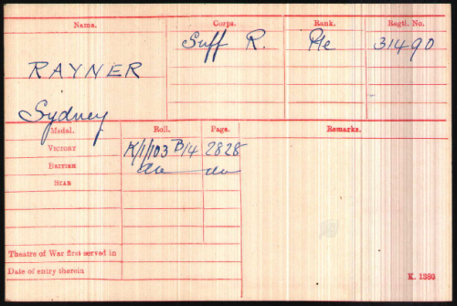 Sydney John Rayner was born in 1885 in Fornham All Saints (Thingoe Q1-1885 4A:705) baptised in All Saints on 1st March 1885, son of Harry and Mary RAYNER