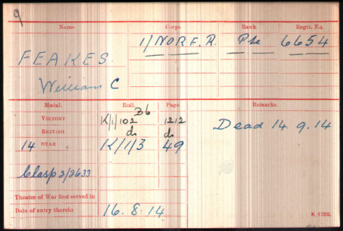 1891 census...Aged 6, he was at No.3 Whepstead Road, Hawstead with his father Walter FEAKES [34] carpenter born Cockfield; his mother Mary A [30] born born Stanningfield; sisters Anna [11] born Stanningfield, Augusta [9] and Olive [2]both born Hawstead; brother Frederick [? months] born Hawstead. 1901 census...Aged 16, farm servant, he was at Old Hall Lane, Fornham St.Martin with his parents; brothers Frederick, Cecil H [4] and Albert E [2] born Fornham St.Martin; sisters Olive M [12]and Millicent [8] both born Hawstead and Doris E [10 months] born Fornham St.Martin From 12th June 1905 to 2nd May 1906 he was with the Norfolk Regiment in South Africa. His father died in 1907 so the parentage of Leslie W Feakes (recorded as son of Mary Ann) is in doubt. 1911 census...Aged 26, single, Army Reservist and farm labourer, he was in Fornham St.Martin with his widowed mother; brothers Cecil Henry (garden boy), Herbert H [5] and Leslie W [1] both born in Fornham St.Martin; sisters Olive Mary and Doris EMMA. He married Lily BRIDGES [2-5-1891] in Fornham St.Martin on 8th May 1911. Their son William Kimberley was born in Fornham St Martin on 4th August 1911 His younger brother Cecil died with the Suffolk Regiment in France in August 1916. see here The "living relatives" form completed by Lily in 1919 (living at School Lane, Fordham St Martin) has:- Father dead, mother at Old Hall Lane, Fornham St.Martin Brothers Frederick James [29] with R.A.V.C. in Gibraltar, Albert Edward [20] with R.A.V.C. Indian Mobile Veterinary, Palestine and Herbert Hammond at home with mother at Old Hall Lane. Sisters Annastasia (Now Mrs LEXTON) in Glasgow with sister Doris Ella; Olive Mary, now Mrs DEAN, at 36 Mill Road, Bury St Edmunds, Augusta FEAKES at 29 Crown Street, Bury St.Edmunds and Millicent FEAKES in Hemingford Gret, Hunts. |