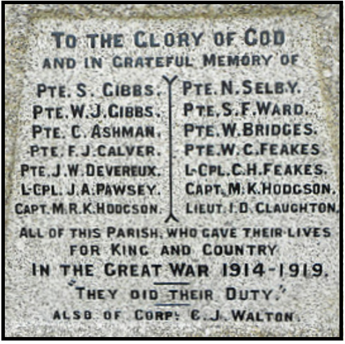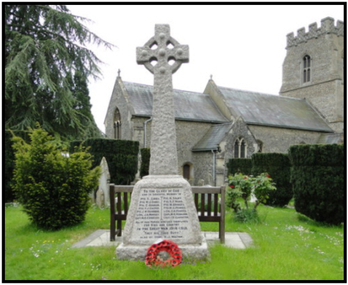 Reported in the Bury Free Press on 9th April 1921 Stirring Addresses at Fornham St Martin - memorial to the Village Fallen Soldiers:- On a glorious April afternoon, with summerlike weather, the memorial cross erected at Fornham St.Martin was unveiled and dedicated on Sunday afternoon in the presence of a large number of people. The memorial, the work of Mr.F.H.Goddard, of Bury St. Edmunds, consists of a silver grey Cornish granite Celtic cross, approximately 16 ft high and stands in the churchyard next to the main road......... The address was given by Canon F.H.Fulford R.D.......Lt.Col. Long O.B.E.,unveiled the memorial and read the list of names, the dedication being performed by the Rev. H.Buckton (rector) Inside the church are framed and glazed Rolls of Honour of those who served and those who died