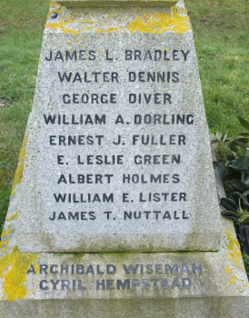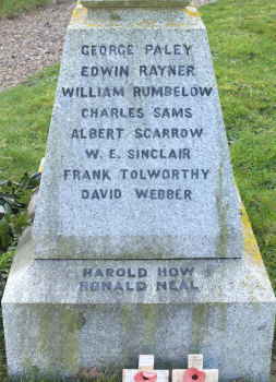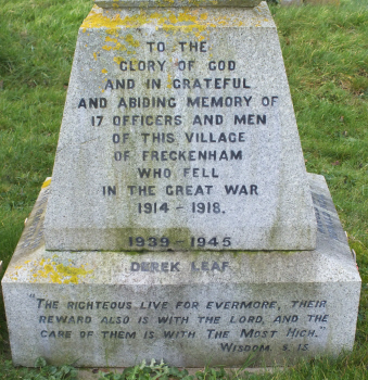 The inscription on the EAST face reads:- GLORY OF GOD AND IN GRATEFUL AND ABIDING MEMORY OF 17 OFFICERS AND MEN OF THIS VILLAGE OF FRECKENHAM WHO FELL IN THE GREAT WAR 1914-1918 and below that 1939-1945 DEREK LEAF and on the plinth "THE RIGHTEOUS LIVE FOR EVERMORE, THEIR REWARD IS ALSO WITH THE LORD,AND THE CARE OF THEM IS WITH THE MOST HIGH" WISDOM. 15 EDWIN RAYNER WILLIAM RUMBELOW CHARLES SAMS ALBERT SCARROW W.E.SINCLAIR FRANK TOLWORTHY DAVID WEBBER and on the plinth below them are HAROLD HOW RONALD NEAL WALTER DENNIS GEORGE DIVER WILLIAM A.DORLING ERNEST J.FULLER E.LESLIE GREEN ALBERT HOLMES WILLIAM E.LISTER JAMES T.NUTTALL and on the plinth below them ARCHIBALD WISEMAN CYRIL HEMPSTEAD ![]() ![]() ![]()