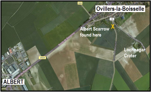 He enlisted in Newmarket. He died on the terrible first day of the Battle of the Somme, when the British had nearly 20,000 killed in one day. Of the 198 men of the 11th Suffolks who died that day, 153 have no known grave. They had moved to their jumping off point at 5 am from the Becourt Wood towards La Boiselle. The actual assault started at 7:30 am but by 8 am it was virtually all over. Heavy machine gun fire decimated the British troops and during the day more of the wounded out in open ground succumbed. Some did stagger on towards the Germans but were cut down by gunfire and flame throwers. Albert was found, (identified by uniform, boots and title) together with several others, as shown here, and re-interred in 1927 in Serre Road No 2 Cemetery |