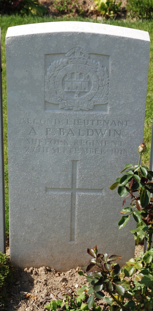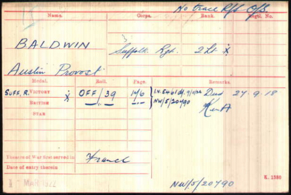 Ausin Provost Baldwin was born in 1883 in Great Barton (1st qtr 1883 Thingoe 4a:651) son of William and Anna Jane BALDWIN (née PROVOST).
