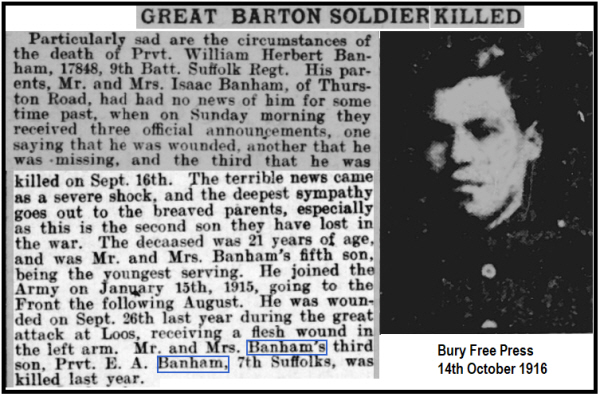 1901 census...Aged 5, he was at Thurston Road, Great Barton with his father Isaac BANHAM [43] road surveyor's foreman born Rattlesden; his mother Elizabeth [43] born Ixworth; sister Mabel [13]; brothers John [12], Sidney [9] and Edward [7] all 4 born in Ixworth; sisters Violet [4] and Maud [2], these two born in Great Barton. 1911 census...Aged 15, a farm labourer, he was at 4 Brocklyn Cottages, Great Barton with his parents, father now a farm labourer; brother Edward (farm labourer), sisters Maud, Hilda [10] and Eliza [6]; brothers Thomas [8] and Harry [5]. All the new siblings were born in Great Barton. His mother had lost 2 of her 15 children. On the pension card his mother was at Thurston Road, Great Barton. She died in 1922 His brother Edward was killed in 1915 near Loos see here |