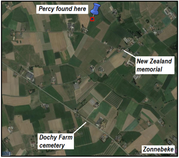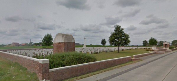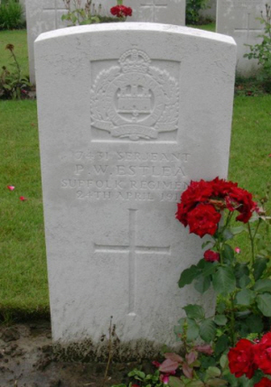 The 1st Suffolks war diary for that time has not been found, but Lt.Col. Murphy's "History of the Suffolk Regiment" tells us that they were in Brigade Reserve between Frenzenberg and Verorenhoek, no shelters, bivouacking under hedges. The CO and Adjutant reached Frezenberg at dawn and soon received orders for Lt.Col. Wallace to command a mixed brigade of 1st Suffolk, 12th London and 1st Monmouth Rangers and take up a defensive position facing north east on the Frezenberg Ridge. The battalion then came under command of Captain Balders who set the men to digging in astride the Ypres-Zonnebeke Road. No sooner had they started when a staff officer told Capt Balders to take the 1st Suffolk and 12th Londons northward and attack any enemy they met. He added that the Germans had broken through and only these 2 battalions stood between the enemy and Ypres, a very critical situation. Capt Balders, despite not wishing to act without his Brigade Commander's orders, realised there was no time to lose, so he unhitched a horse from a gun limber and rode off to Brigade HQ. Once there he was given orders to try and establish himself in the hamlet of Fortuin. Under shell fire they moved forward and in passing Fortuin came across a Canadian HQ and was asked to use his two battalions up to help the Canadians. This he was loathe to do without orders, but when the 2 Canadian officers were hit, he decided to send the Canadians some help. The enemy fire increased and he was informed that the Germans now held St Julien. The men, out in the open, were set to dig in and overnight managed to dig a fire trench 4.5 feet deep with traverses, a remarkable feat. The situation by the 26th was so desperate that documents were being burnt, but the delaying efforts this group had given Allied reinforcements time to arrive and ease the situation. Exact figures of killed each day must of course be inaccurate in the circumstances, but CWGC records 50 killed of the 1st Suffolk on 24th, of which only 6 have known graves. "