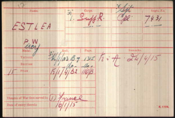 1891 census...Aged 8 months, he was at Hundred Lane, Old Newton with his father William ESTLEA [28] grocer's porter; his mother Jane [31]; sisters Margaret J [7], Beatrice M [3] and Esther M [2]; brother Adolphus [6]. All were born in Old Newton. 1901 census...Aged 10, he was at Thedwastre Hill, Thurston with his widowed mother; brother Cecil A (Adolphus ?) stable lad, Harry W [7] born Old Newton and Rowland [5] born Thurston; sisters Beatrice and Esther. His father had died in 1899. 1911 census...Aged 20, he was in Egypt, a private in the 1st Battalion, Suffolk Regiment. His mother had married Thomas DORLING in 1901 and was living with him at East Barton Cottages with Percy's sister Esther and brother Rowland On the pension card his mother was at East Barton. His brother in law Charles ROWELL ( married to Esther) died in Colchester Military Hospital in 1920 see here |