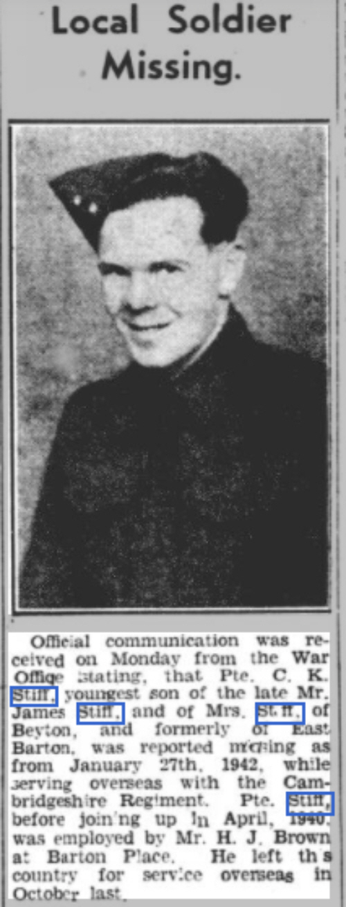 Charles Kitchener Stiff was born on 6th February 1917 (1st qtr 1917 Bury St.Edmunds 4a:1522 son of James and Elizabeth STIFF(née ASTLE)