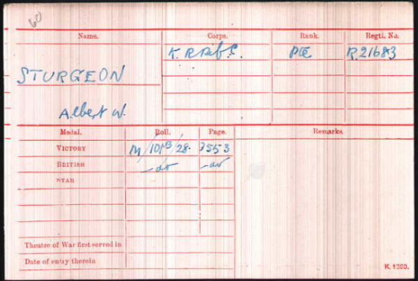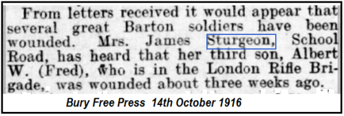 Albert William Sturgeon was born in Great Barton (3rd qtr 1884 Thingoe 4a:659), son of James and Elizabeth STURGEON (née FOULGER)