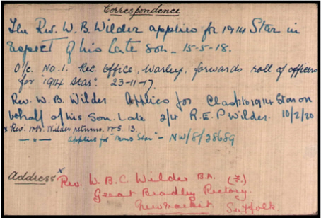 Reginald Connor Phillips Wilder was born in 1896 in Great Bradley (Risbridge Q1-1895 4A:733), baptised in Great Bradley on 24th March 1896, son of Reverend
