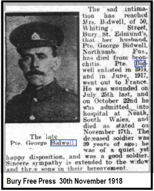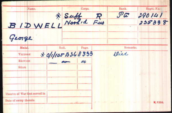 George Bidwell was born in Hessett (4th qtr 1879 Stow 4a:608) son of Isaac and Sarah BIDWELL (née OSBORNE)