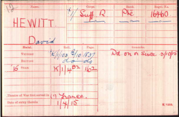 The battalion were on what is now the SW outskirts of Auchy-les-Mines, at the junction of Little Willie trench and the Hohenzollen Redoubt. On the 3rd October 1915 the war diary has:- 3rd Oct - Between 5 and 6 am the enemy, having gained a footing in LITTLE WILLIE (held by 1st Weksh),came rapidly down the trench from left to right bombing their way through 1st Welsh and 2nd Cheshires, forcing D Coy backward into the barrier. The survivors (26 men) falling back over the open on to the support trench in rear This bombardment was most violent and the grenades which were very large, were well thrown, came in a constant hail, breaking down all resistance and killing all before it. The barrier previously built by C Coy stopped any further advance. Capt Freeman, 2 Cheshire Regt took command of D Coy half hour before this attack took place as there were no officers of the Coy left. Capt Lamb being wounded and 2 Lieut killed the previous night. The battalion was relieved by the Kings Own Royal Lancashire Regt at 3pm and took up a position in reserve in the control VERMELLES Keep for the night. From 1st to 3rd it seems the battalion had 26 killed, 100 missing believed killed and 115 wounded. CWGC has 34 dead on 3rd, only 3 having a known grave.