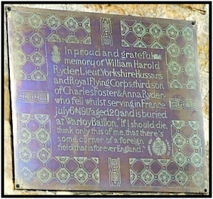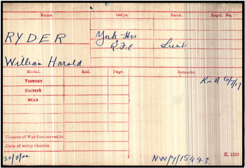 William Harold Ryder was born in 1896 (Wetherby Q4-1896 9A:122), Baptised Bardsey, York, 21 November 1896, 3rd son of Charles Foster and Anna RYDER (née POTTER).