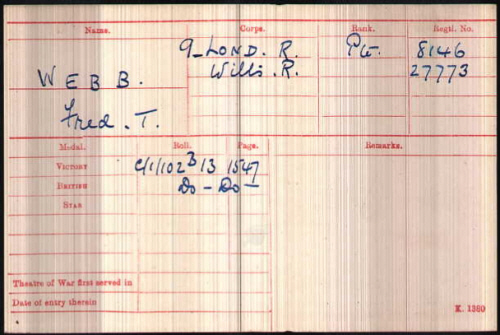 1891 census...Aged 8, he was at Thurlow Road, Great Bradley with his father Samuel WEBB [36] a builder born in Clare; his mother Catherine [36] born in Little Thurlow, sisters Frances Alice [6] and Ethel [4] and brother Cecil [2], all born in Great Bradley. 1901 census...Aged 18, a butcher, he was boarding with butcher Urban Arthur BROWN and his family at 9 Queens Street, Haverhill. His parents were in Great Thurlow with his sisters Frances, Ethel and Elizabeth [9] born Gt Bradley; brothers Cecil, Edwin [7] and Wilfred [3], the last two being born in Great Thurlow. 1911 census...Fred had not been found in this census. At The Manse in Thurlow were his parents, sisters Frances and Elizabeth; brothers Cecil (bricklayer), Edwin (butcher's boy) and Wilfred (school). All 7 siblings survive. He is unlikely to have been in the Army as if so he would have been mobilised much earlier. His address for probate was 222 Uxbridge Road, Shepherds Bush, Middlesex. He does not appear to have married, as probate, in the sum of £608-9s-5p, was granted to his Father Samuel. Fred enlisted in Hammersmith, London and stated that he lived in Great Thurlow. |