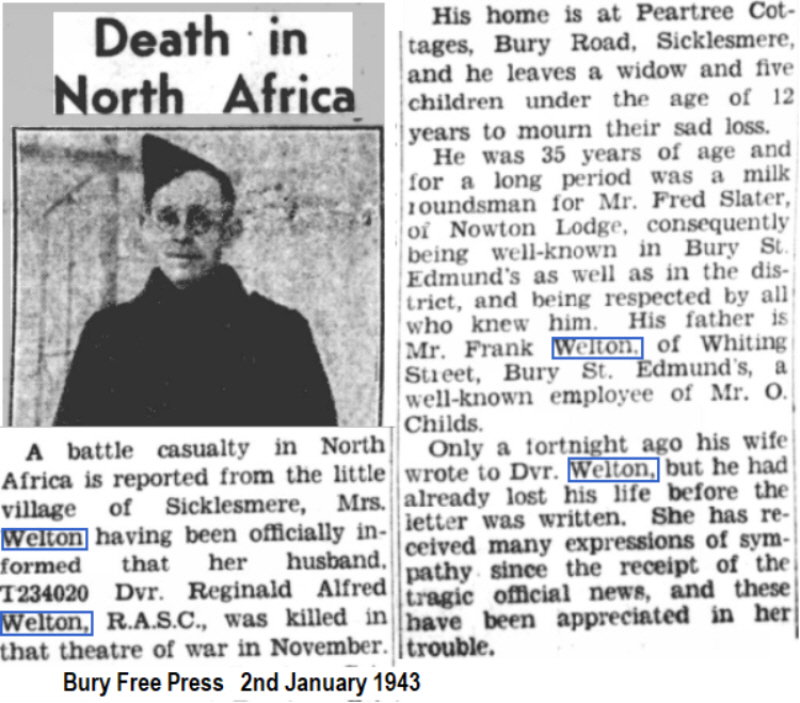 Reginald Alfred Welton was born on 30th October 1907 in Bury St.Edmunds (4th qtr 1907 Bury St.Edmunds 4a:914), son of Frank Ernest George and Jessie WELTON