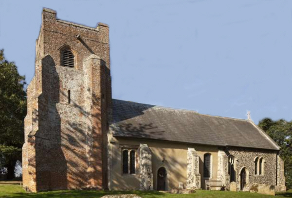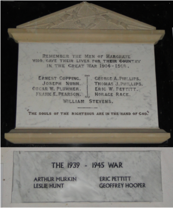 Inside the church of St.Edmund's Hargrave, on the wall, is a white marble plaque 50 cm high x 75 cm wide on a black marble back board. The plaque has a laurel