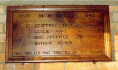 This shelter was built by Mr Frederick Hunt, unveiled on 11th November 1949 by Major General R.H.Dewin and dedicated by Rev J.D.Sayer (Rector of Whepstead) and Rev. G.Rushden (local Methodist Minister)