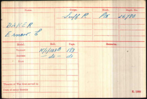 Ernest Edward Baker was born in 1884 in Hartest(3rd qtr 1884 Sudbury 4a:631) son of Robert Christopher and Jane BAKER(née OSBORNE)