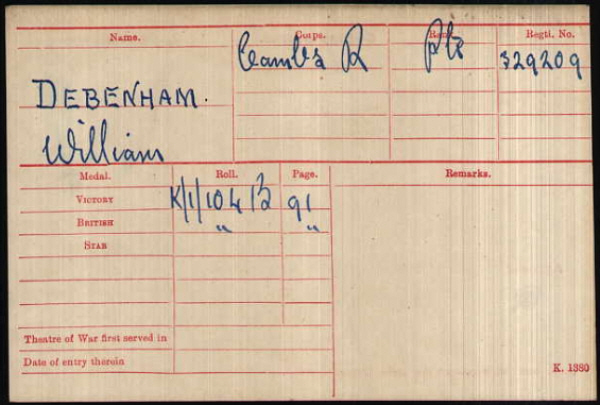 1891 census...Aged 9, he was at Tye Green, Glemsford with his father Alfred DEBENHAM [37] bricklayer; his mother Agnes A [38]; brothers Harry [15] bricklayer, Walter H [13]; sister Annie R [3].All were born in Glemsford. His mother died in 1893 and father married Poslingford born Julia ATKINSON later that year 1901 census...Aged 19, a bricklayer, he was at Tye Green with his parents and sister Annie. His father died in 1903 1911 census...From his Suffolk Regiment number he would have just enlisted in the Army. His stepmother was a cook for Ralph and Mary Thompson at 6 Belsize Square, Hampstead On the pension card his widow was at North End Cottage, Hartest. He married Mabel BRADNAM [6-12-1890] in 1914 |