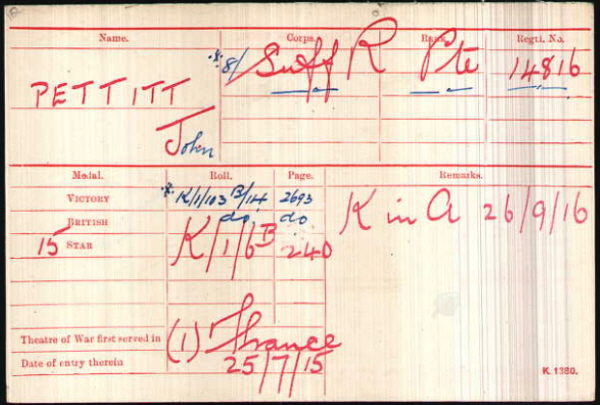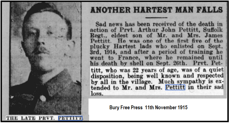 Rrthur John Pettitt was born in 1894 (3rd qtr 1894 Sudbury 4a:704) son of James and Ann PETTITT (née PAYNE). Some Army records have him as John Pettitt