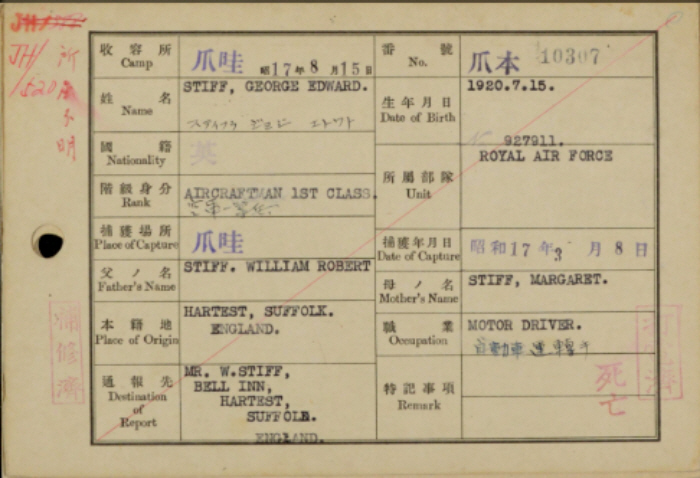 station (Kokura Military Hospital), after being transported Japan on the Singapore Maru on 28th October 1942. The Singapore Maru is entered on the list of "Hell Ships"