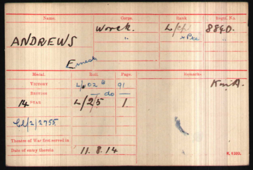 His battalion had moved to India from Malta in 1908, returning to UK in 1912. Ernest returned to Haverhill where he was well known as a boxer. At the outbreak of hostilities he was mobilised and arrived in France on 11th August 1914. Arriving in Ciply early on 23rd August, near Mons, he survived the Battle of Mons and the retreat. At the time of his death his battalion were in the Hooge area, east of Ypres, but Ernest was actually with the 3rd Division Cyclist Company and their exact whereabouts has not been found. Eliza was given the sad news of his death by friends in December, but nothing official came until January. The family successfully claimed for the clasp to his 1914 Star, the pre-requisite to officially becoming recognised as an Old Contemptible. The South West Suffolk Echo of 5th December 1914 had reported that:- "A friend of Lance Corporal A.E.Andrews (8840) 3rd Division Cycle Coy., has received a letter from a Sergt-Major to say he was killed on the 13th November whilst he was in the trenches. His parents who live at 11 Croft Row, have not received any official information from the War Office." and on 30th January 1915:- " The parents of Lance Corporal E.Andrews, residing at 11 Croft Row, have received the following letter from the War Office:- Madam, In reply to yours of the 4th January 1915, I am commanded by the Army Council to inform you that No.8840 Lance Corporal E.Andrews of the Worcestershire Regiment has been reported in a casualty list which has now reached this office as being killed in action on the 13th November 1914. I am to express the sympathy of the Army Council with the soldier's relatives. Every endeavour is being made with a view to the early collection of personal effects of the deceased and of the amount due to the estate, by some delay must necessarily occur"