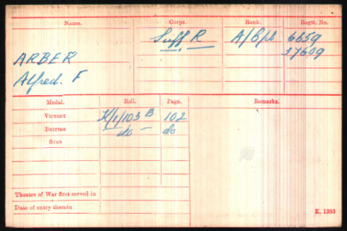 Alfred Frank ARBER was born at 2 Station Road, Haverill on 18th April 1884 ( Risbridge Q2-1884 4A:585), baptised in St Mary's Haverhill