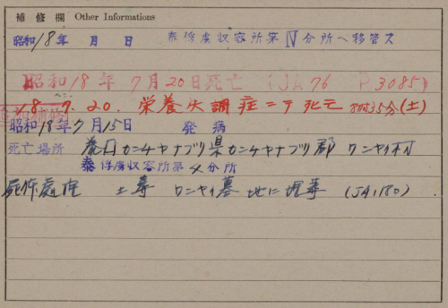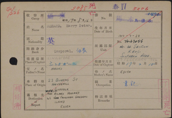 In October 1940 Harry joined the Royal Army Ordnance Corps, quickly making the rank of Corporal. Harry was captured on the 15th February 1942 when the British surrendered to the Japanese. He was then put to work on the Siam-Burna railway. Harry was initially buried in Tarsao No.2 Cemetery, grave 18, another Haverhill man, Sidney Pavey, also a POW, was in his burial party. He was moved to Kanchanburi in 1946. |