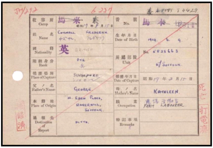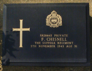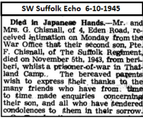 Frederick joined the Suffolk Regiment on 20th June 1939, aged just 19. Allocated the army number 5828663 he was posted to "D" Coy, 5th Battalion. The 4th and 5th Battalions, Suffolk Regiment were attached to the 18th East Anglian Division which following Pearl Harbour, was to find itself in the Far East. After the fall of Singapore on 15th February 1942, about 620 'Suffolks' became POWs. Many, like Frederick, were transported to work on the Burma-Thailand Railway. The Echo of 8th January 1944, reported that: 'Mr & Mrs Geo Chisnall, 4 Eden Place, have received a post-card from their son, Pte F. Chisnall, 5th Suffolk Regiment, saying that he is in No1 POW Camp, Thailand, and is in good health. No previous news of him had been received since the fall of Singapore. Mr and Mrs Chisnall have four other sons serving. Driver Chas and Driver George, both serving in the RASC, one of whom is overseas. L Cpl Mark Chisnall is with the Pioneer Corps and Lc Bdr Thomas Chisnall, serving with the Canadian Army has just returned to this country from Canada where he has been for the past eight years.'
